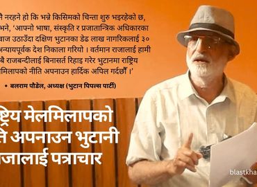 भुटान पिपल्स पार्टीका अध्यक्ष बलराम पौडेलले राष्ट्रिय मेलमिलापको नीति अपनाएर भुटानी शरणार्थीलाई स्वदेश फर्काउन भुटानका राजा ज ...
