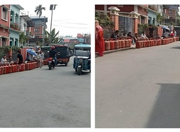 धरान १५ स्थित कामख्य ग्यास डिलरमा ग्यास लिन बिहानदेखि लाइनमा बसेका उपभोक्ताहरू ...