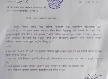 विजयपुर । आगामी दिनमा तीव्र हावाहुरी चल्ने सम्भावनालाई ध्यानमा राख्दै धरान उपमहानगरपालिकाले विद्यालयहरूलाई विशेष सतर्कता अपना ...